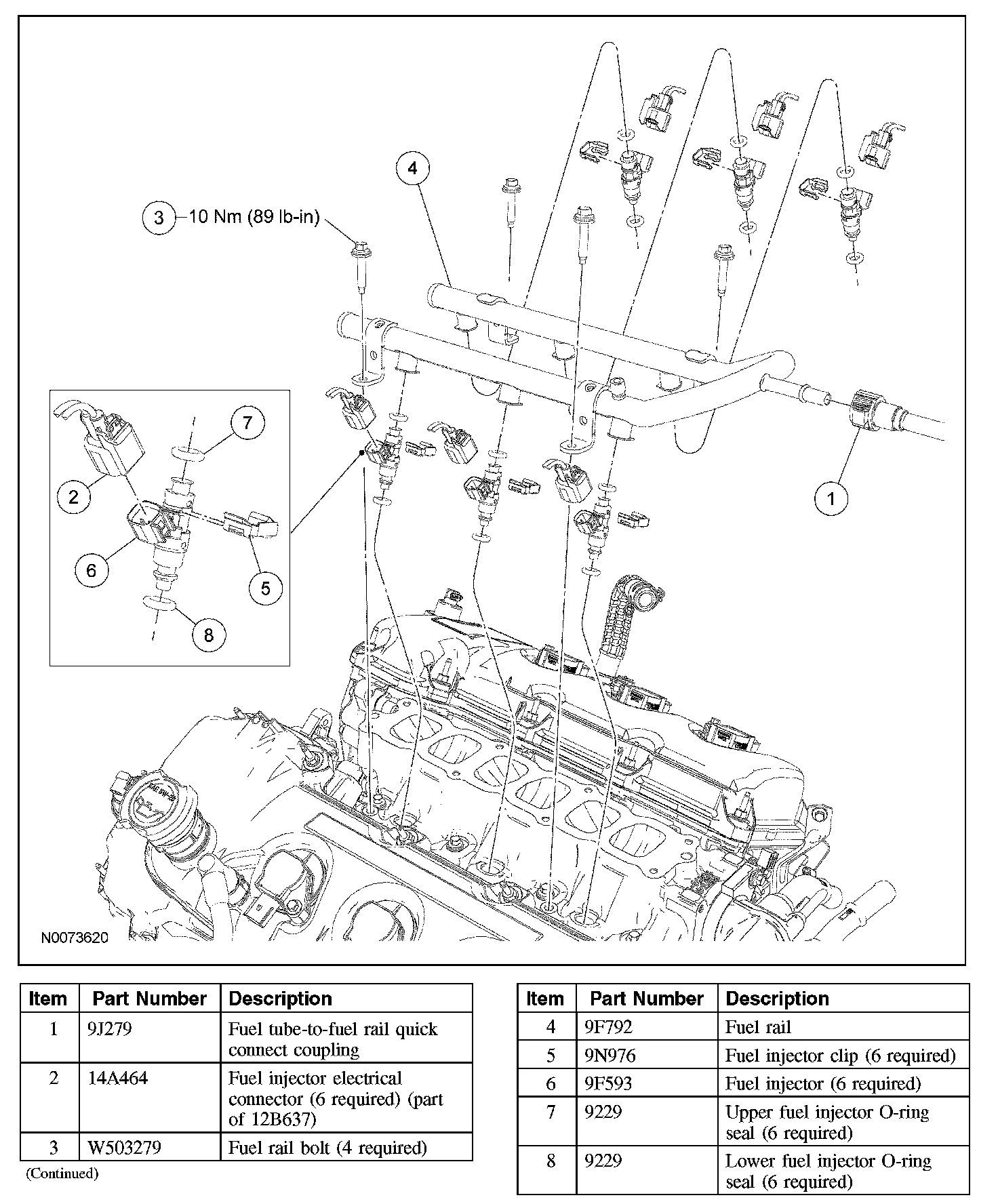 Install the 6 fuel injectors and the 6 fuel injector clips into the fuel rail.