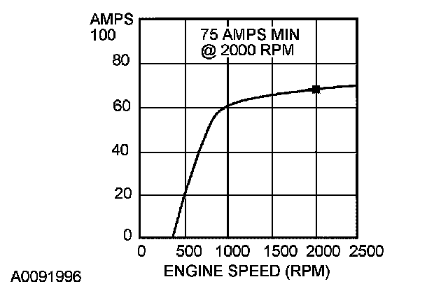 4. With the engine running at approximately 2,000 rpm, adjust the tester load bank to determine the output of the generator. Generator output should be greater than the graph shown below. If not, refer back to the pinpoint test or GO to Symptom Chart. Pinpoint Tests Symptom Related Diagnostic Procedures