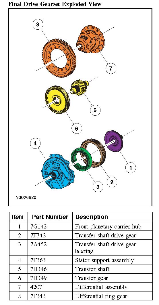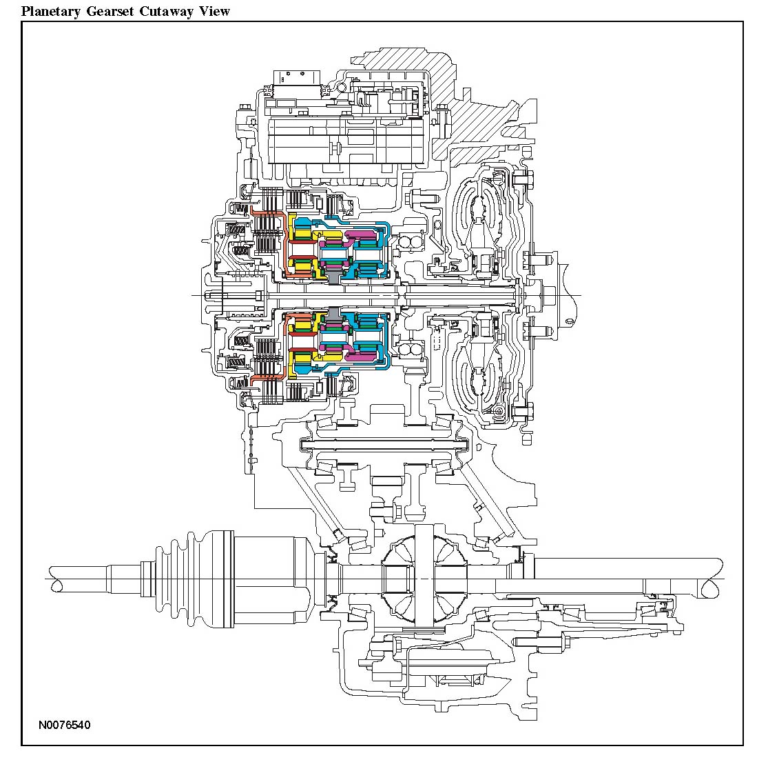 The planetary gear set transfers power to the transfer shaft drive gear through the front planetary carrier hub. The transfer shaft drive gear is part of the stator support assembly. The transfer shaft drive gear turns the transfer shaft and gear assembly which multiplies torque through gear reduction and turns the differential ring gear.
