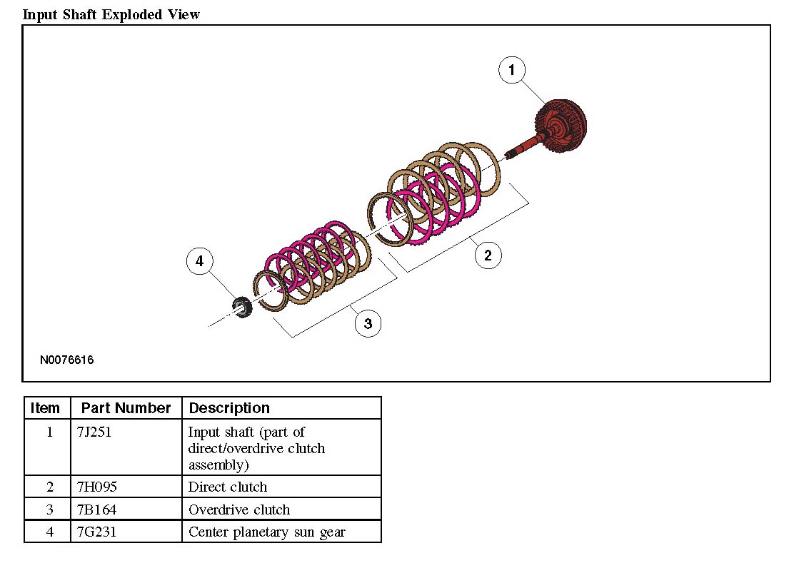 The input shaft is part of the direct/overdrive clutch assembly and is splined to the torque converter turbine and the center planetary sun gear. The input shaft transfers power from the torque converter to the rear planetary gearset through the direct (3, 5, R) and overdrive (4, 5, 6) clutches and the center planetary sun gear.
