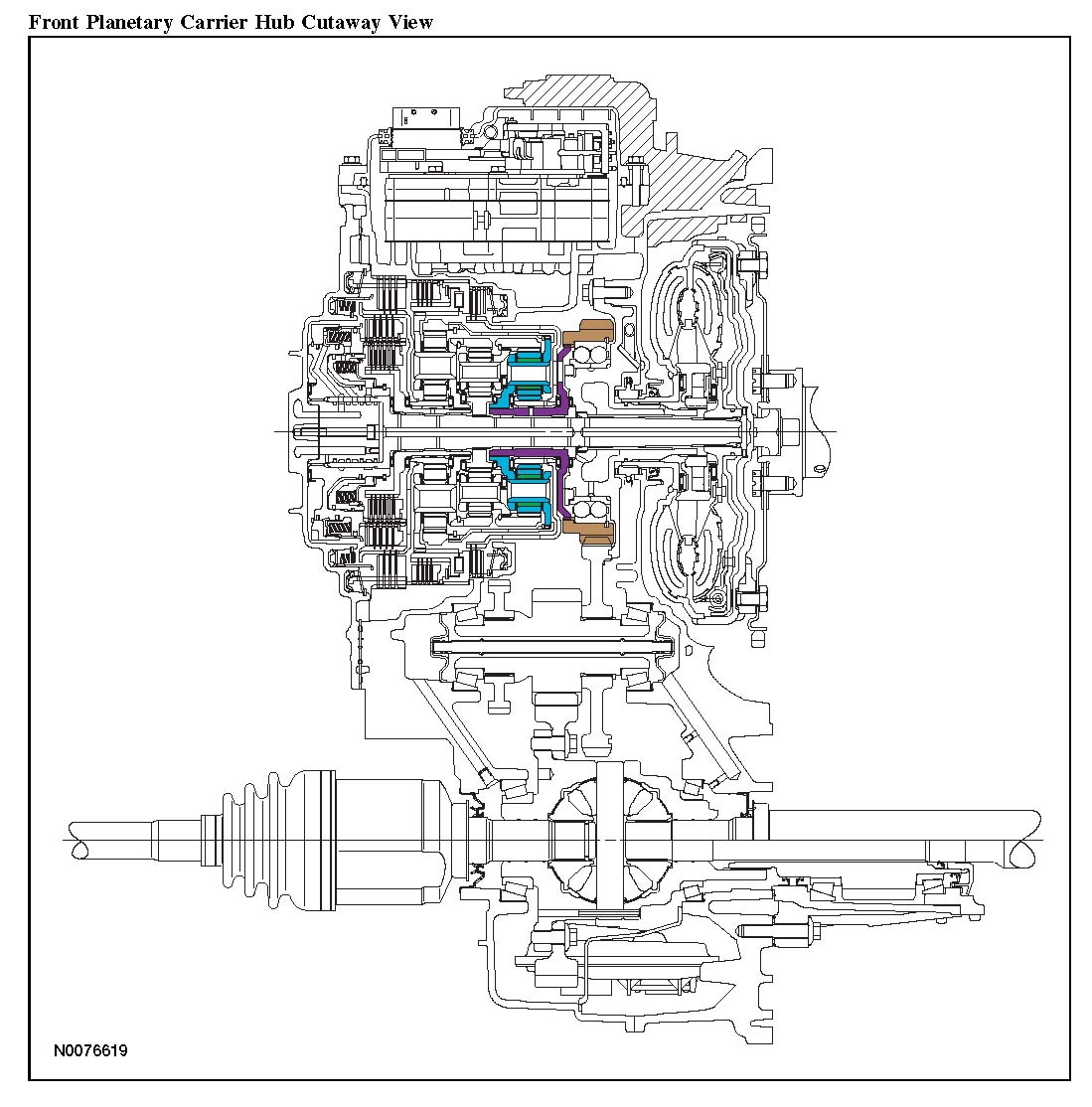 The front planetary carrier hub is splined to the front planetary carrier and the transfer shaft drive gear. This allows torque to be transferred from the planetary gearset to the final drive gearset.