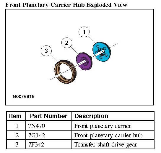 The front planetary carrier is splined to the rear planetary ring gear and transfers power from the rear planetary gearset to the front planetary gearset in 2nd, 3rd, 5th and 6th gear and reverse. The front planetary carrier is splined to the transfer shaft drive gear. The front planetary carrier is the output component for the planetary gearset.