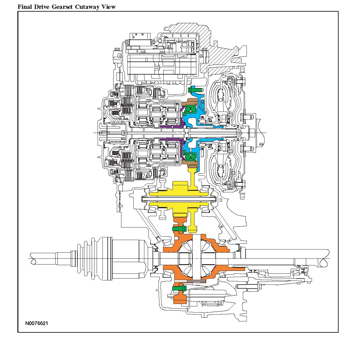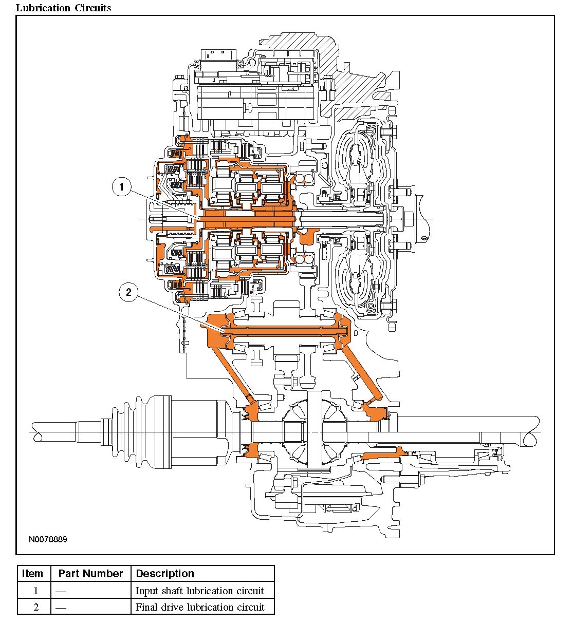 The transmission fluid enters 2 main lubrication circuits, the input shaft and final drive lubrication circuits, through the transaxle cover and flows through passages in the transaxle to lubricate the transaxle.