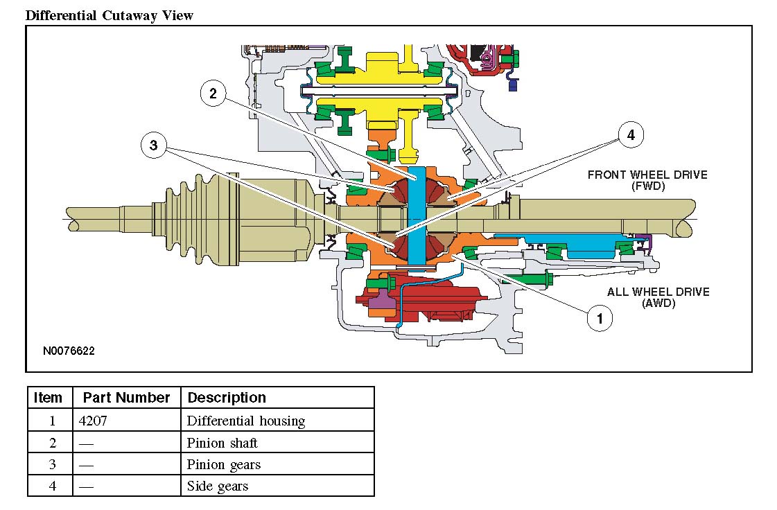 The differential allows the halfshafts and wheels to rotate at different speeds during cornering and transfers power to the power transfer unit (PTU) for all wheel drive (AWD) vehicles.