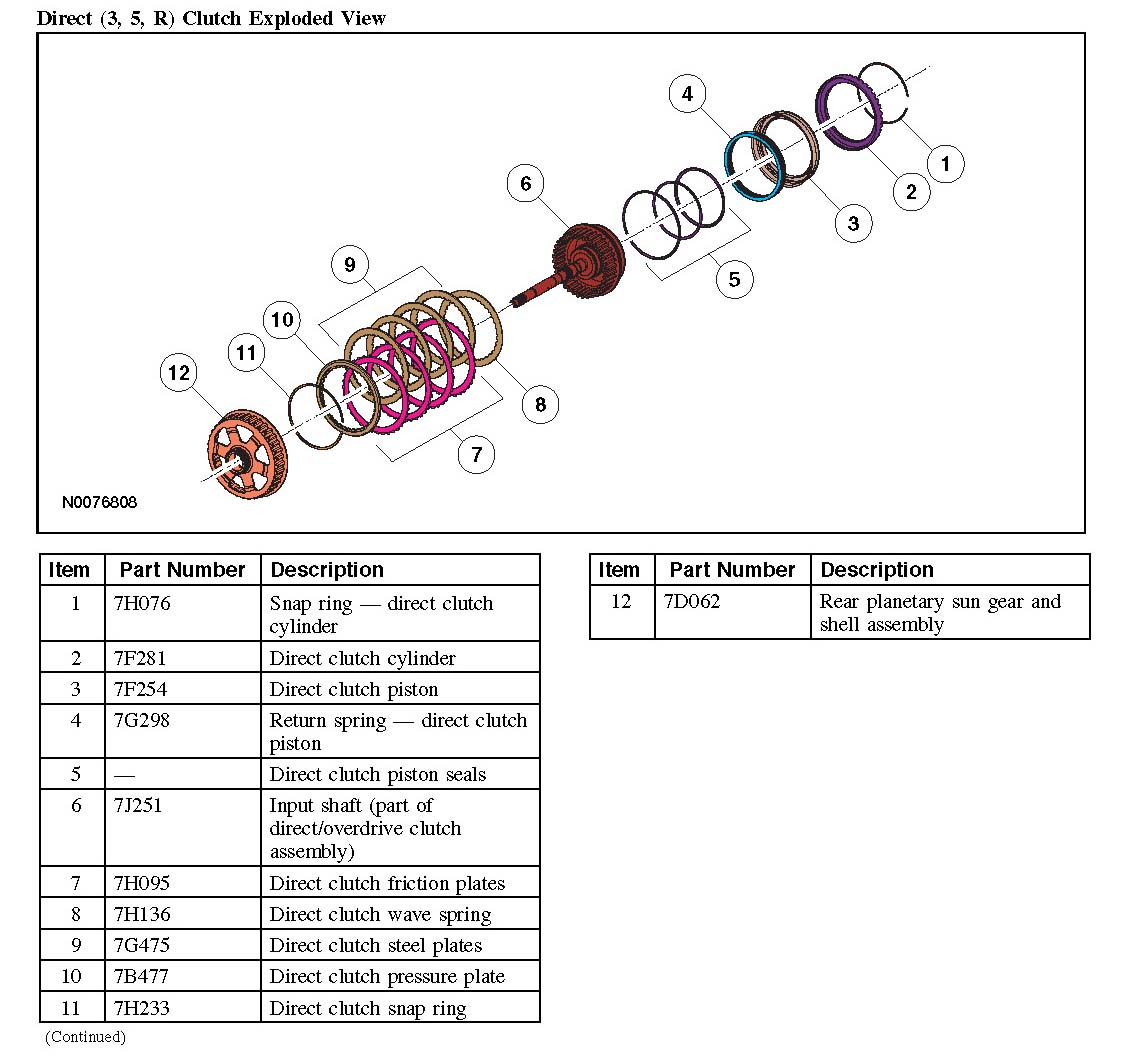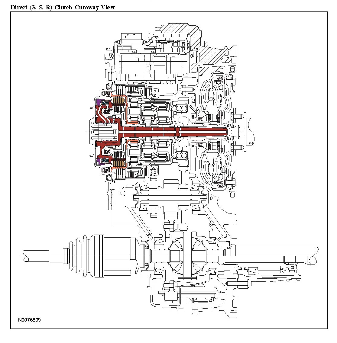 The direct clutch is a drive clutch that transfers power from the direct/overdrive hub and shaft assembly to the rear sun gear. The direct clutch is applied in 3rd and 5th gear and reverse.