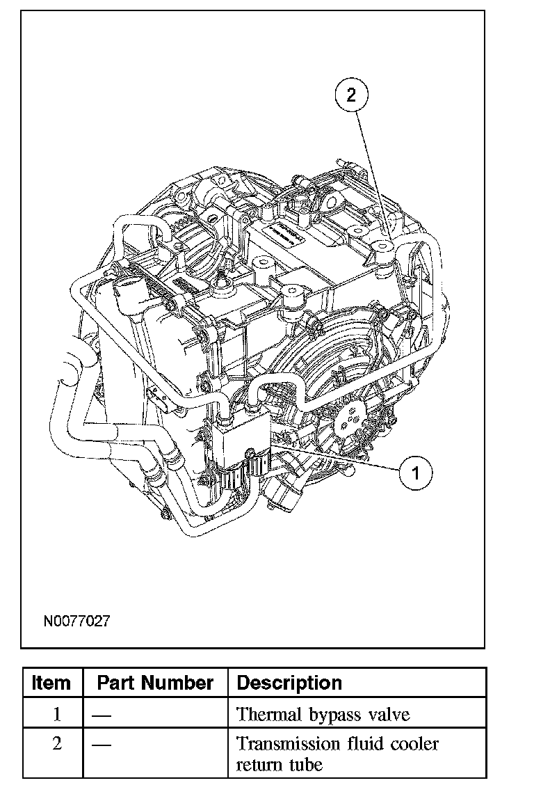 Transmission fluid enters the lubrication circuits after flowing through the transmission fluid cooler, mounted at the front of the vehicle. When the transmission fluid is not up to operating temperature a thermal bypass valve, mounted in line of the transmission fluid cooler tubes, allows the transmission fluid to bypass the transmission fluid cooler. Transmission fluid returns to the transaxle from the transmission fluid cooler tubes through the back transmission fluid cooler tube.