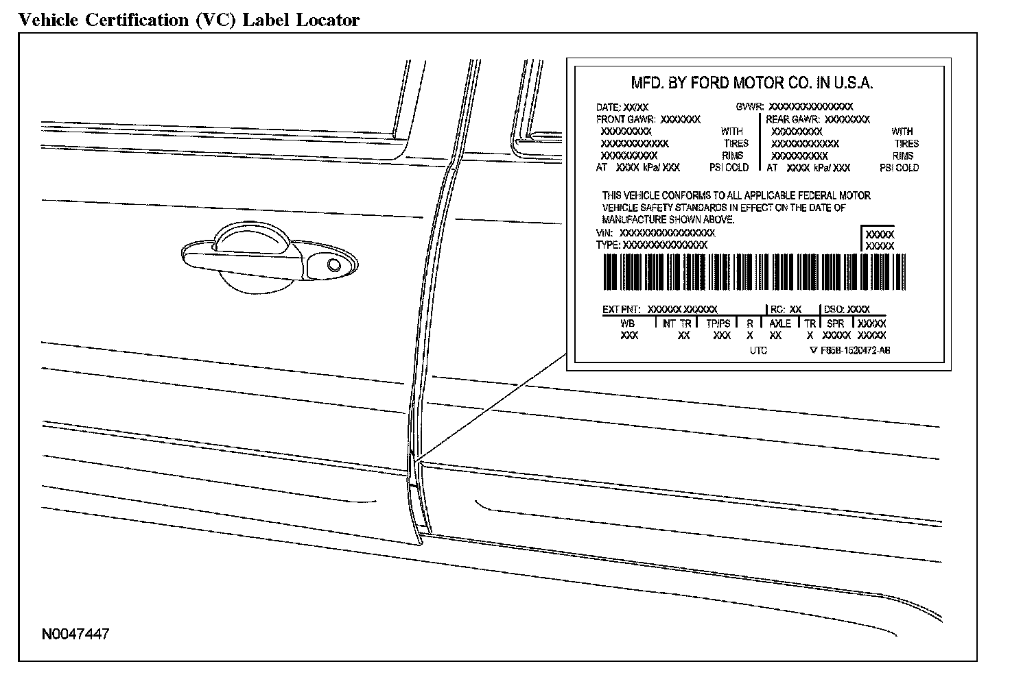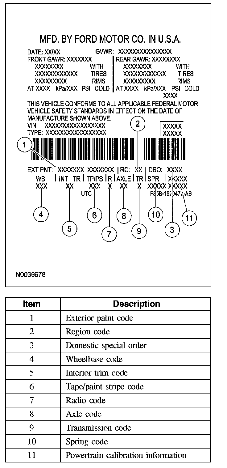 The upper portion of the vehicle certification (VC) label contains the manufacturer's name, the month and year of manufacture, the certification statement and the VIN. It also includes gross vehicle weight rating (GVWR). The VC label is located on the left-hand door jamb. The serial number can also be found on the engine block, transmission and frame.