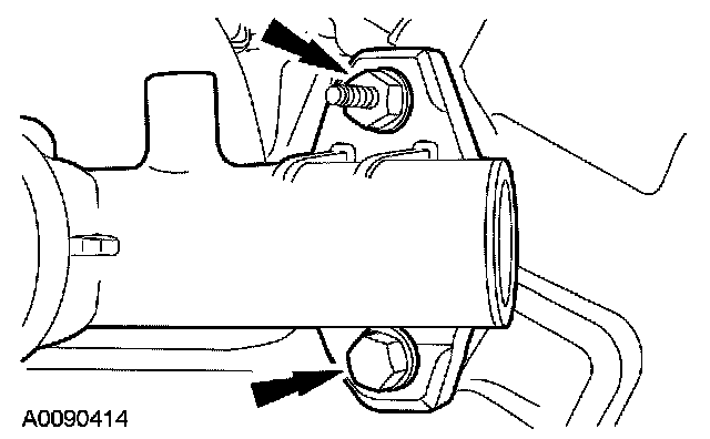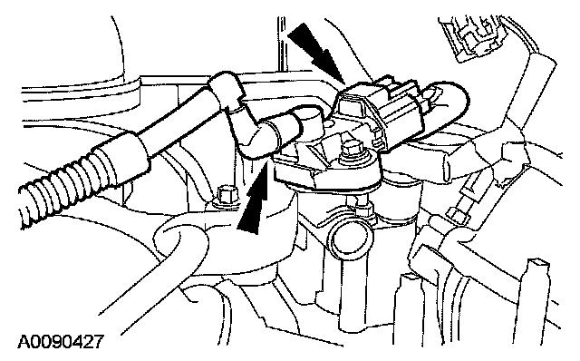 43. Disconnect the 2 hoses and remove the thermostat housing.