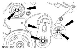 54. Remove the 3 bolts and the accessory belt drive tensioner, LH and center idler pulley.