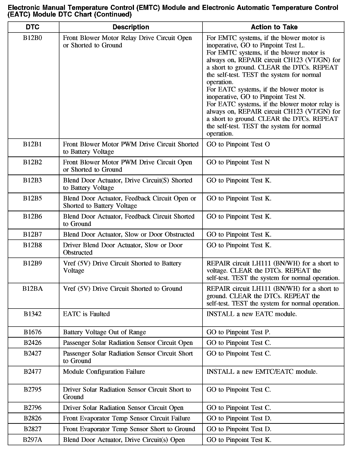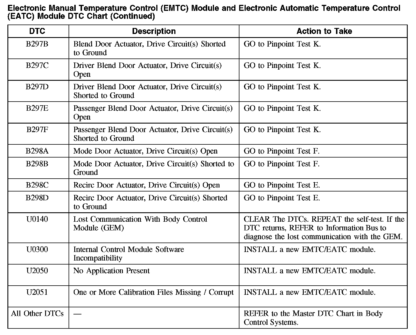 ELECTRONIC MANUAL TEMPERATURE CONTROL (EMTC) MODULE AND ELECTRONIC AUTOMATIC TEMPERATURE CONTROL (EATC) MODULE DTC CHARTNOTE: Some PCM DTCs may inhibit A/C operation. If any PCM DTCs are retrieved, diagnose those first. Refer to Computers and Control Systems.
