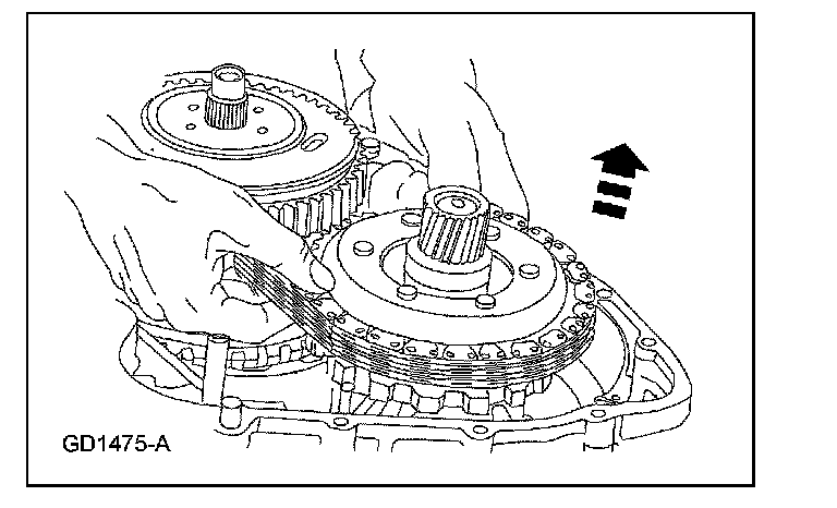 38. Separate the drive chain assembly from the driven sprocket assembly and reverse/overdrive ring gear assembly.