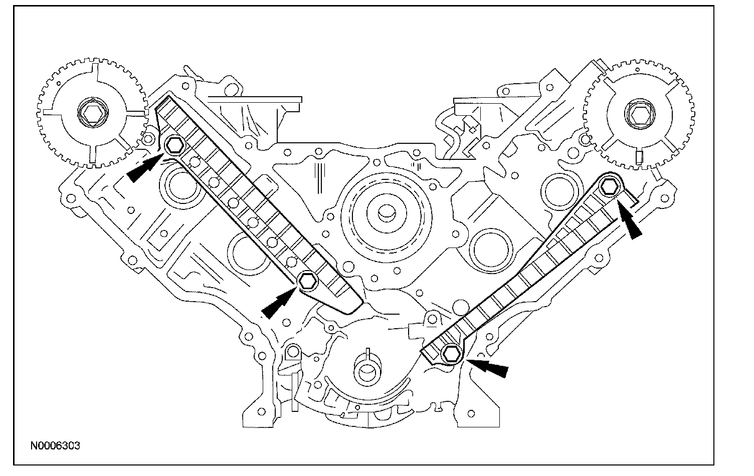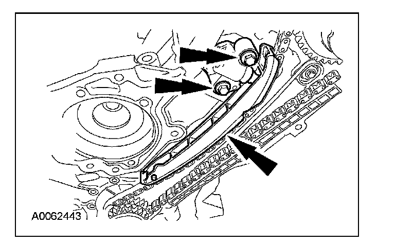 46. Position the RH timing chain tensioner arm on the dowel pin and install the RH timing chain tensioner and bolts.