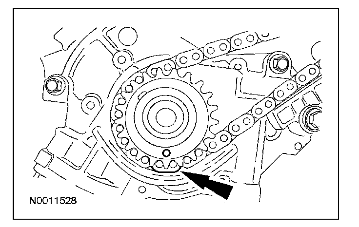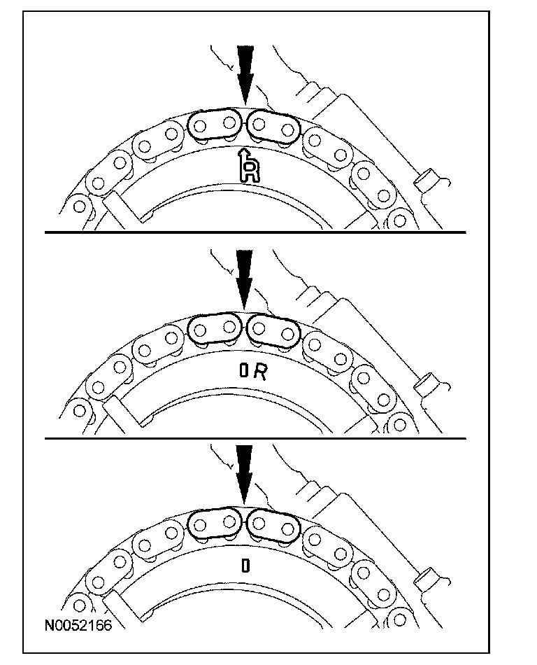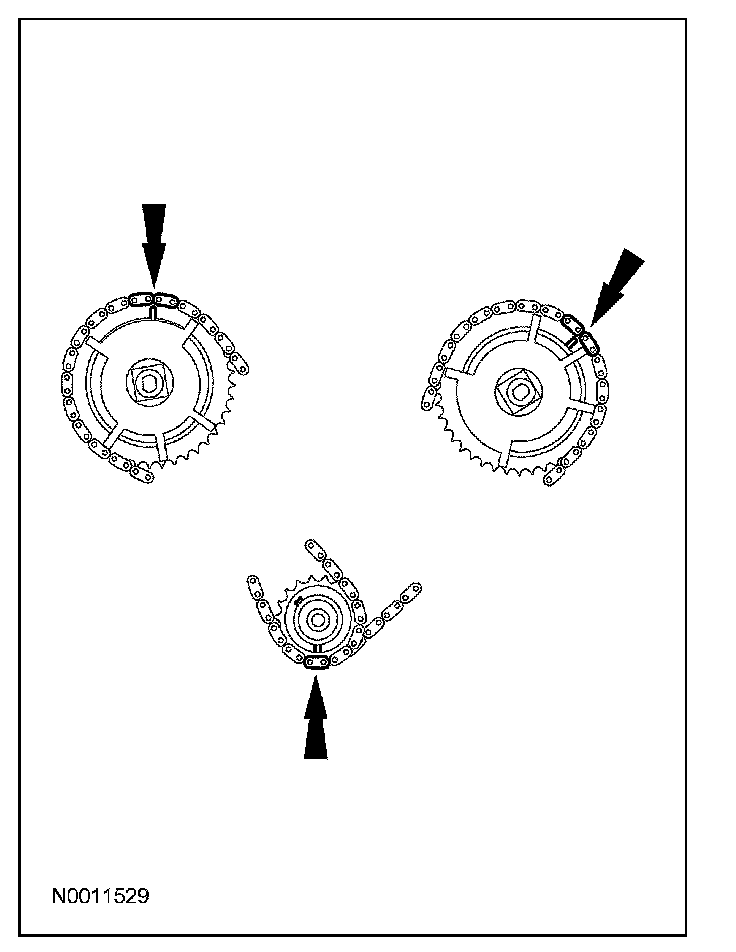 Position the RH timing chain on the VCT phaser sprocket with the timing mark positioned between the 2 copper (marked) chain links.