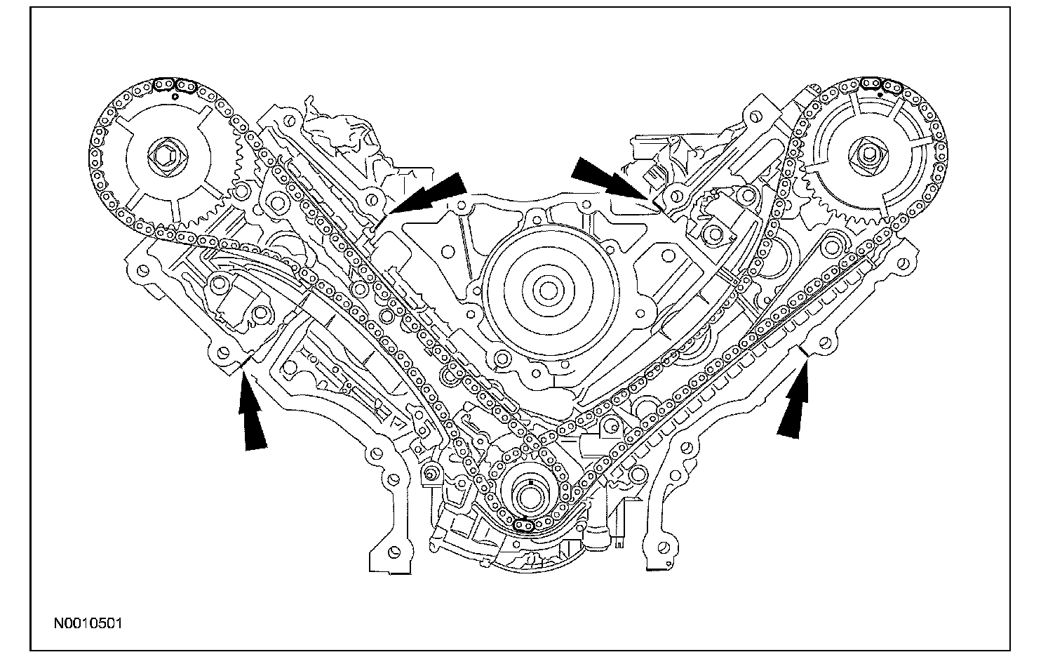 39. Install the 4 bolts and the LH and RH timing chain guides.