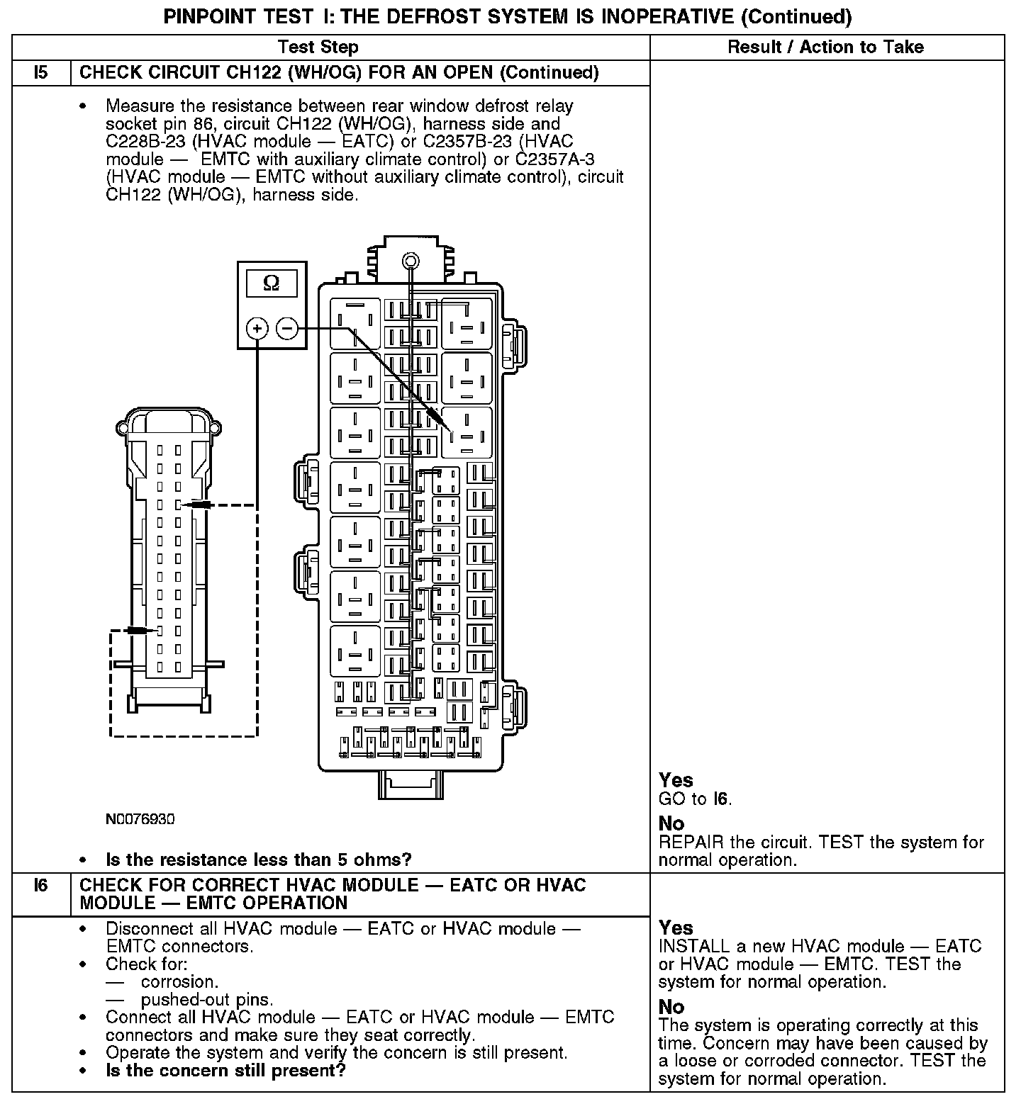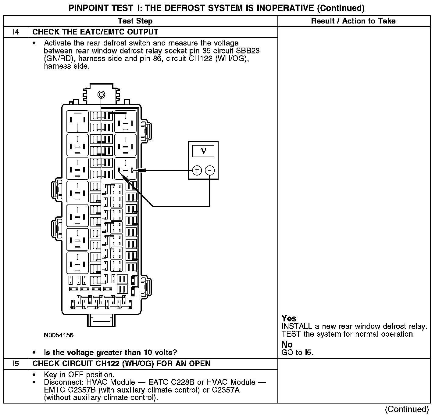 During normal operation, the heating ventilation air conditioning (HVAC) module - electronic automatic temperature control (EATC) module or HVAC module - electronic manual temperature control (EMTC) activates the rear window defrost relay by grounding the relay coil through circuit CH122 (WH/OG). When the defrost relay is activated, power is supplied from the relay to the rear window defrost grid through circuit CRD06 (BN/YE) and also to the LH/RH exterior rear view mirror heaters through circuit CBB23 (BN/YE). Ground is supplied to the rear window defrost grid and exterior mirror heaters through circuit GD150 (BK/WH).