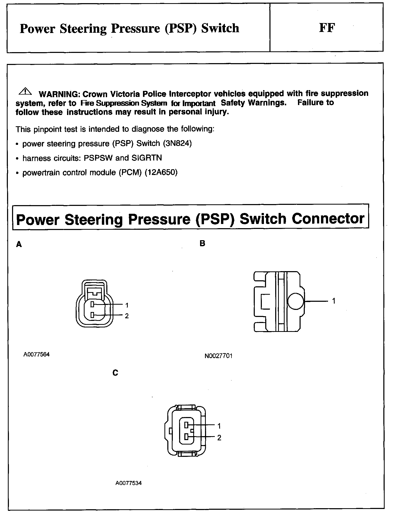 PINPOINT TEST FF: POWER STEERING PRESSURE (PSP) SWITCHWarning And Power Steering Pressure (PSP) Switch Connector: