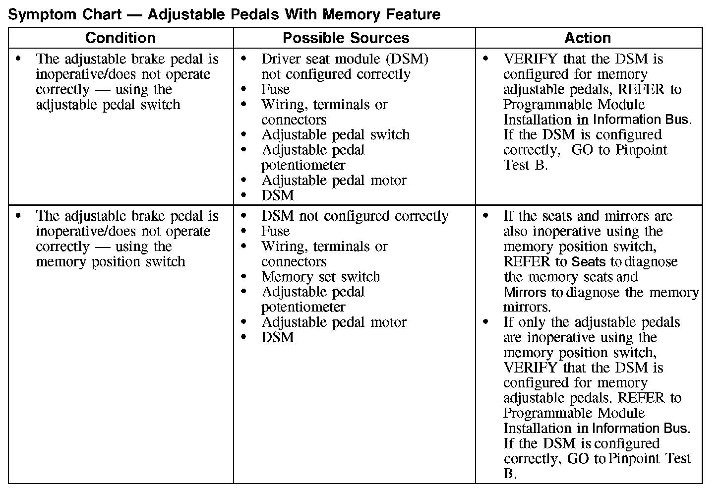 Symptom Chart - Adjustable Pedals With Memory Feature