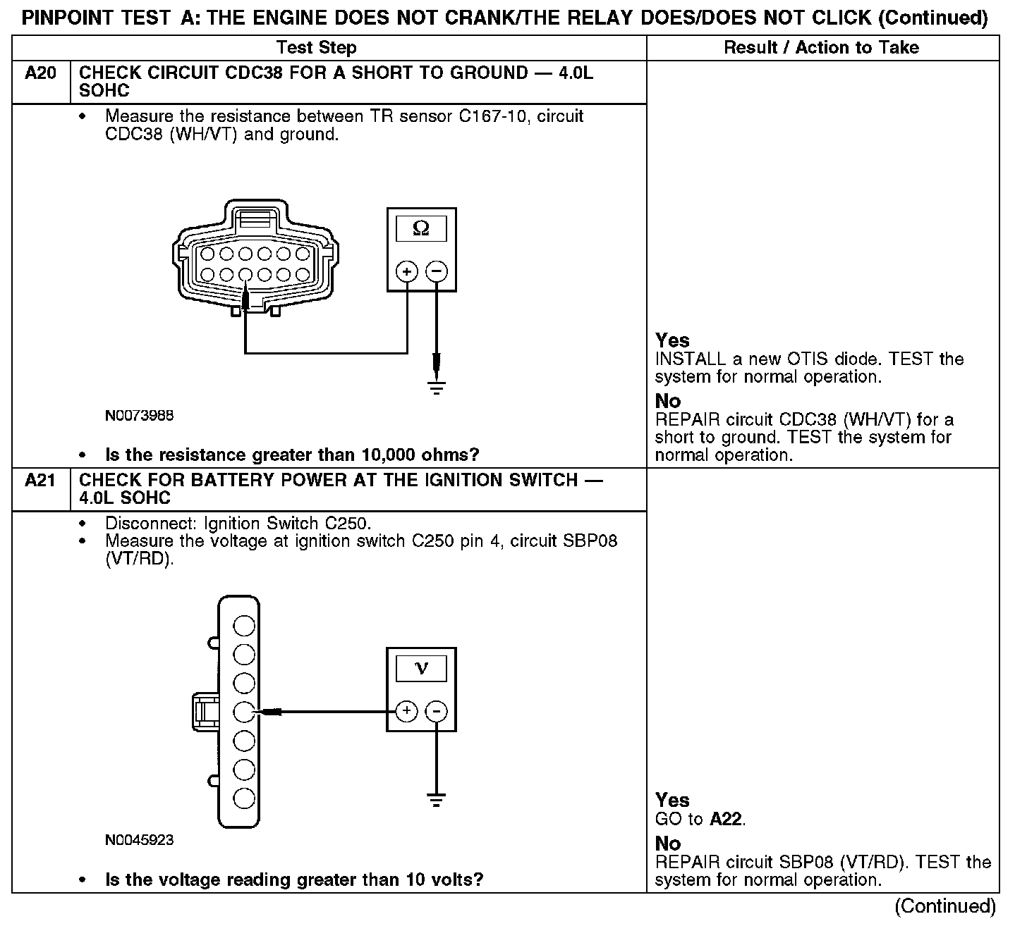 Under normal operation, constant power is supplied to the starter motor relay from battery junction box (BJB) fuse 11 (30A). When the ignition switch is turned in the START position and held, power flows to the one-touch integrated start (OTIS) diode through circuit CDC35 (BU/WH). Power then flows to the digital transmission range (TR) sensor (4.0L SOHC engines only) and to the starter motor relay through circuit CDC38 (WH/VT). A ground is supplied through circuit CDC12 (YE) from the PCM, causing the starter motor relay coil to energize and the relay contacts to close. This allows power to be supplied from the starter motor relay contacts which then flows through circuit CDC25 (BN/GN) to the starter solenoid. The solenoid is grounded at the starter motor. Energizing the starter solenoid engages the starter drive into the ring gear and closes the solenoid contacts, allowing power directly from the battery through circuit SDC02 (RD) to the starter motor to start the engine.