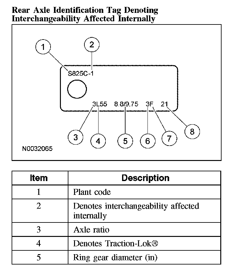The plant code denotes a particular axle design, a specific ratio and if it is a conventional or limited slip (Traction-Lok(R)) type. In addition, the plant code will not change as long as that particular axle assembly never undergoes an external design change. If, however, an internal design change takes place during the production life of the axle and that internal change affects component interchangeability, a dash and numerical suffix is added to the plant code.
