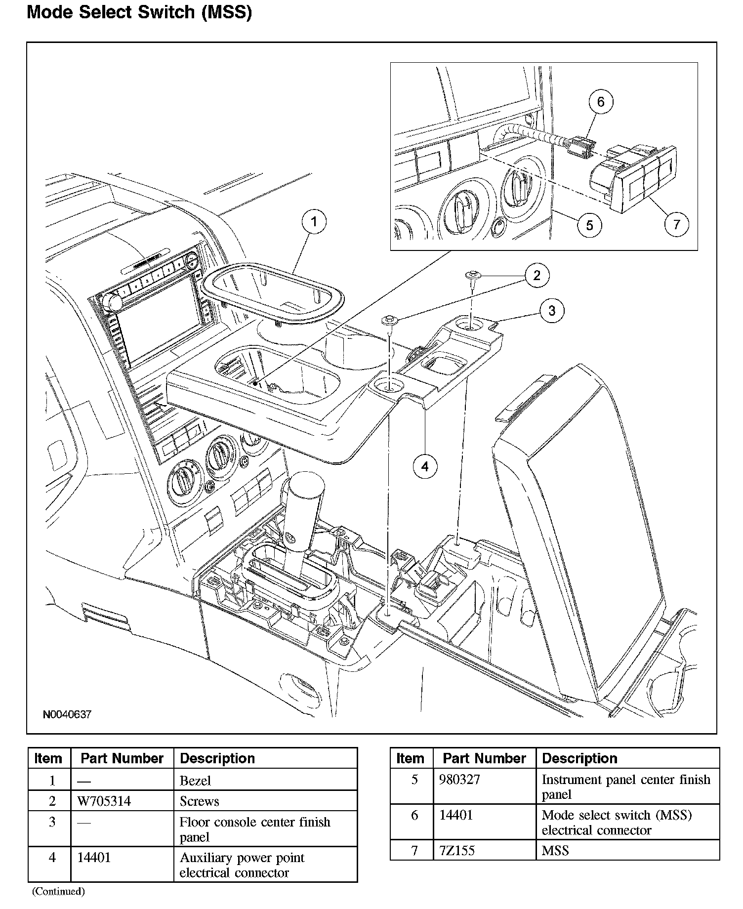 4. Raise the floor console center finish panel and disconnect the auxiliary power point electrical connector.
