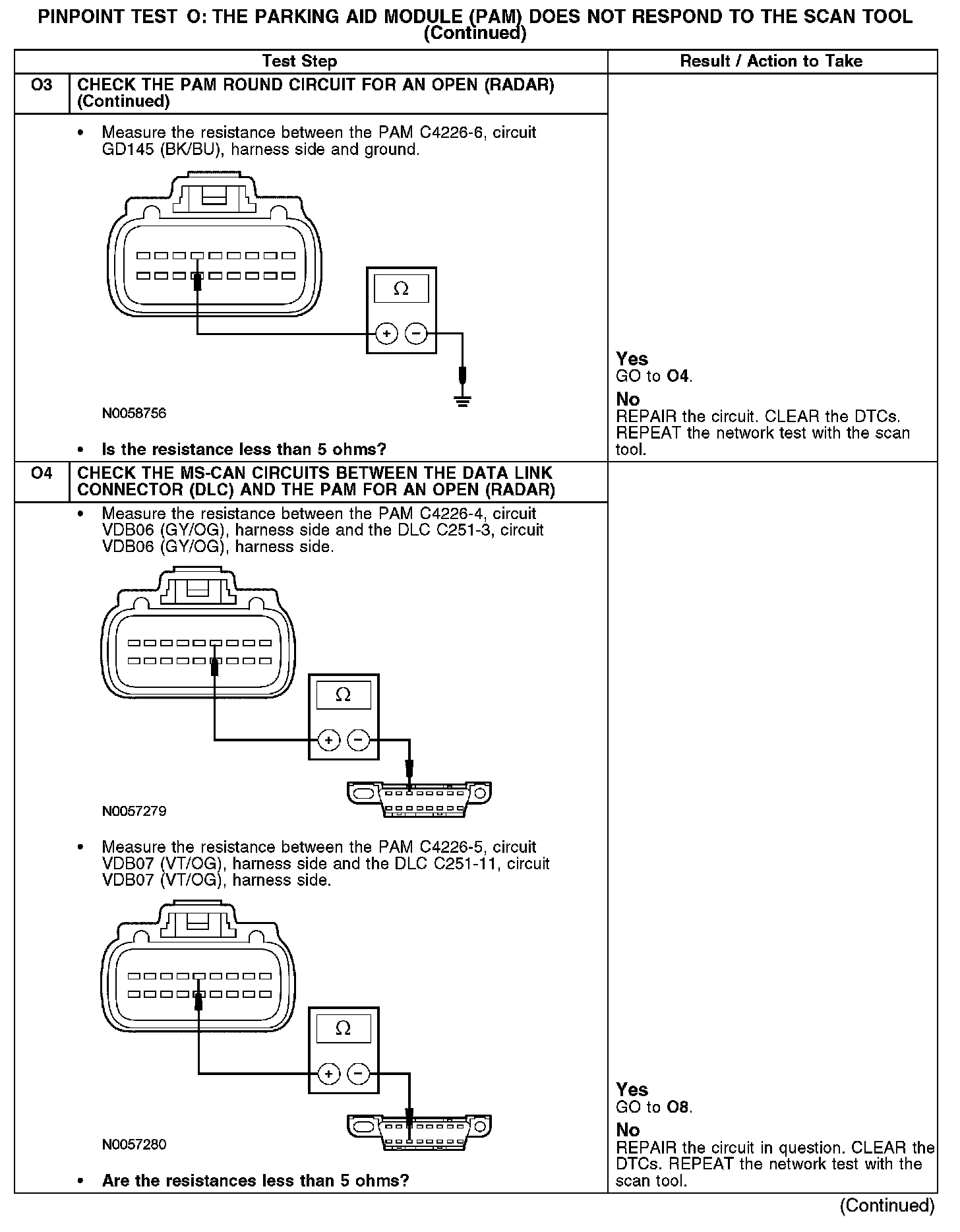 The parking aid module (PAM) communicates with the scan tool through the medium speed controller area network (MS-CAN). Circuits VDB06 (GY/OG) (MS-CAN +) and VDB07 (VT/OG) (MS-CAN -) provide the network connection to the PAM. The PAM shares the MS-CAN with the instrument cluster (IC), the smart junction box (SJB), the heating ventilation air conditioning (HVAC) module (if equipped), the audio control module (ACM), the rear entertainment module (RETM) (if equipped), the satellite digital audio receiver system (SDARS) module (if equipped), and the power running board (PRB) module (if equipped). Voltage for the PAM is provided by circuit CBP18 (GY/OG). Circuit GD145 (BK/BU) provides ground.