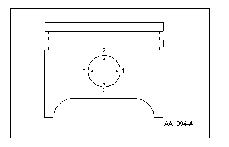 1. Measure the piston diameter 90 degrees from the piston pin and 42 mm (1.65 in) down from the top of the piston at the point indicated.