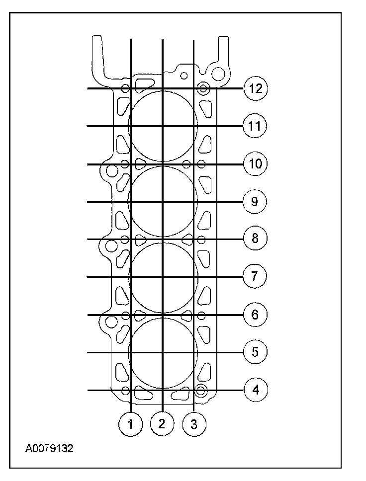 Using a straightedge and a feeler gauge, inspect the cylinder head for flatness in the sequence shown.