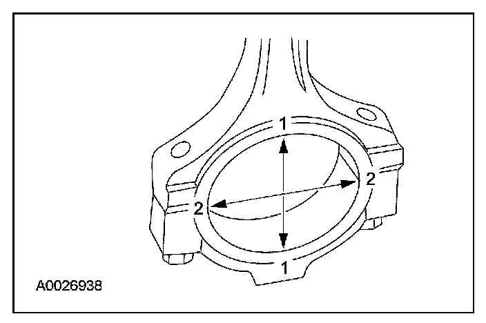 1. Tighten the bolts to specification, then measure the bore in 2 directions. The difference is the connecting rod bore out-of-round. Verify the out-of-round is within specification.