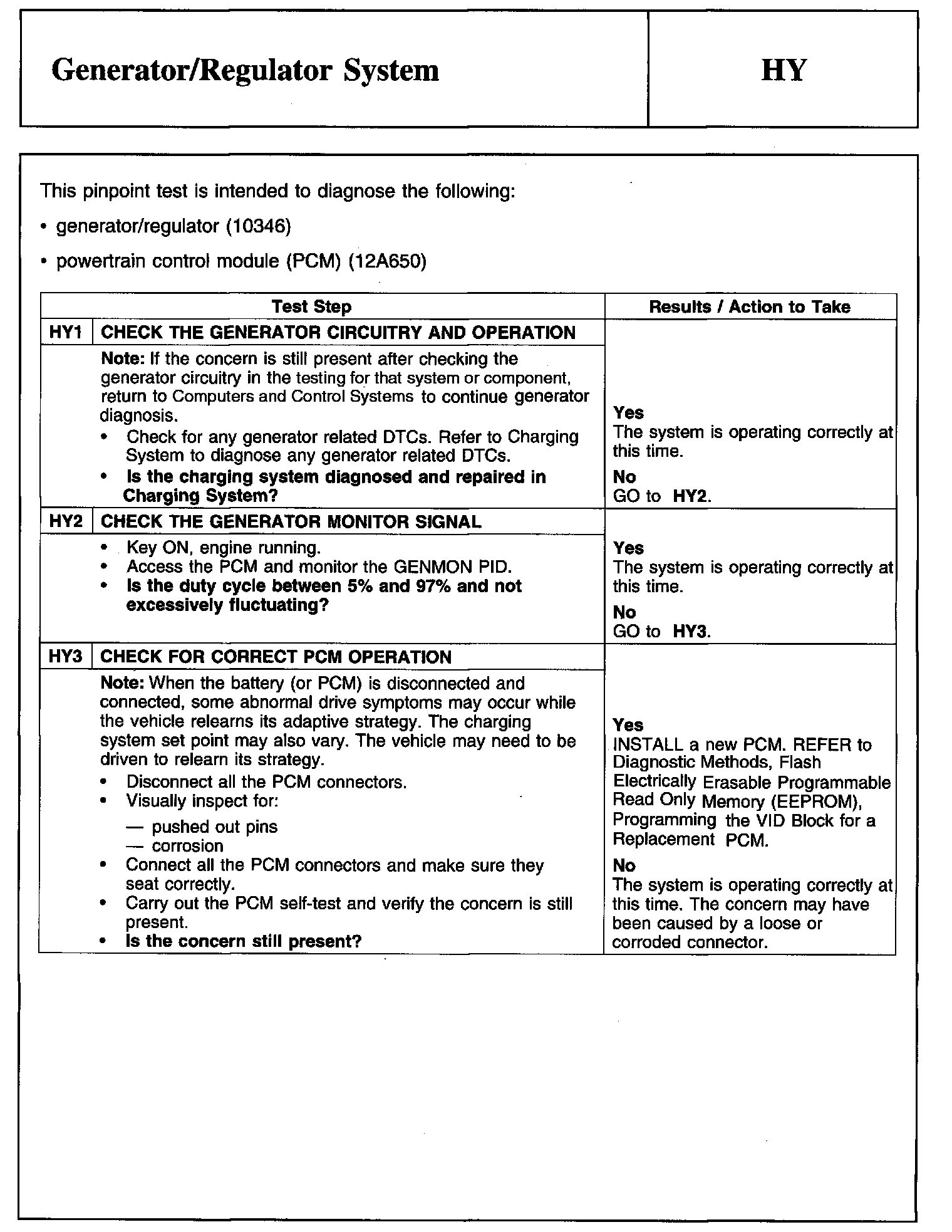 PINPOINT TEST HY: GENERATOR/REGULATOR SYSTEM