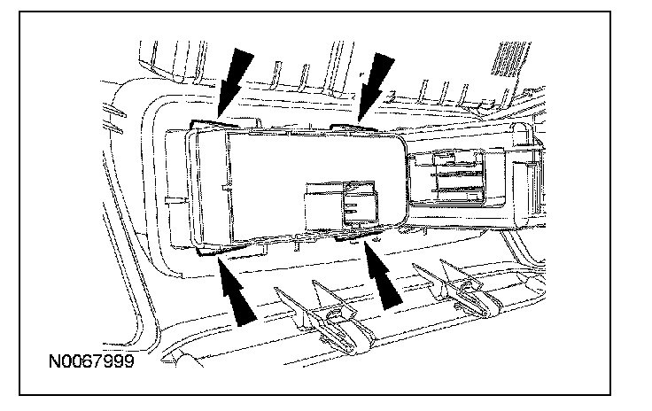 2. CAUTION: The clips holding the coin tray/storage bin or the auxiliary switch assembly (if equipped) to the center finish panel are very stiff. Care must be taken not to damage the coin tray/storage bin, switch assembly or center finish panel during removal.