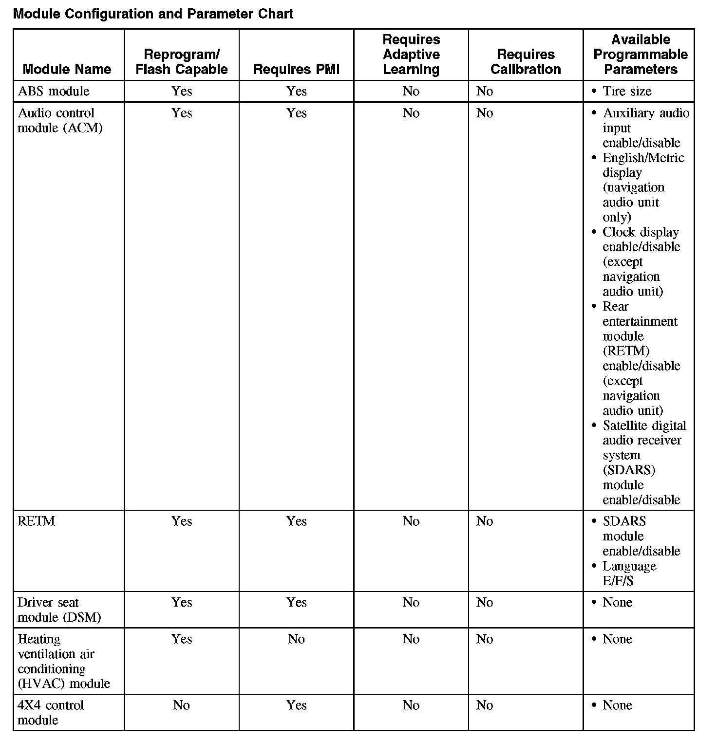 Programmable parameters are customer preference items that may be modified by the dealer via scan tool or in some cases modified by the customer following a procedure listed in the vehicle Owner's Literature. While many configuration options may exist for a module, only a few of these options are programmable parameters.