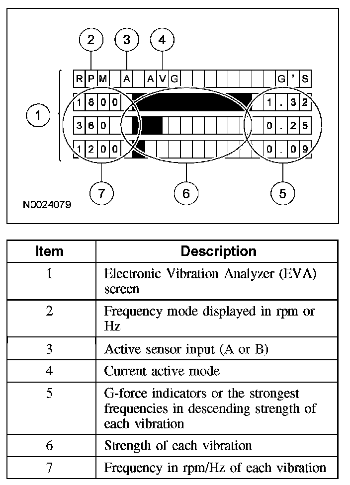 The Electronic Vibration Analyzer (EVA) is a hand-held electronic scan tool which will assist in locating the source of unacceptable vibrations. The vibration sensor can be remotely mounted anywhere in the vehicle for testing purposes. The unit displays the 3 most common vibration frequencies and their corresponding amplitudes simultaneously. A bar graph provides a visual reference of the relative signal strength (amplitude) of each vibration being displayed and its relative G-force. The keypad is arranged to make the EVA simple to program and use. Some of the functions include the ability to average readings as well as record, play back and freeze readings. The EVA has a strobe balancing function that can be used to detect imbalance on rotating components such as a driveshaft or engine accessories.