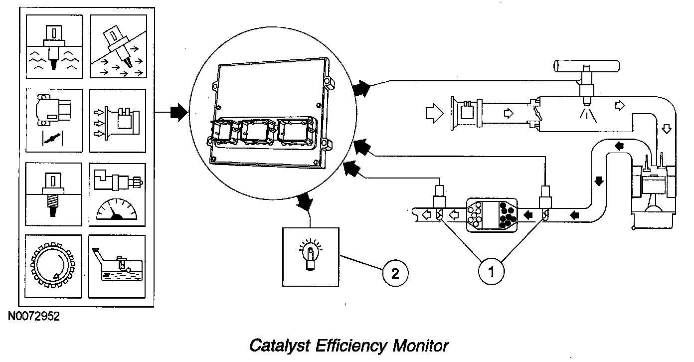 Inputs from engine coolant temperature (ECT) or cylinder head temperature (CHT), intake air temperature (IAT), mass air flow (MAF), crankshaft position (CKP), throttle position (TP), and vehicle speed sensors are required to enable the Catalyst Efficiency Monitor.