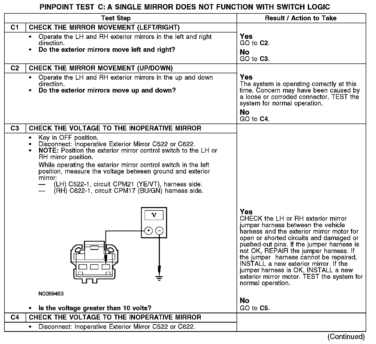 - When power is received through circuit CPM17 (BU/GN)/CPM21 (YE/VT) and ground through circuit CPM23 (GY), the LH/RH exterior mirror will operate left.
