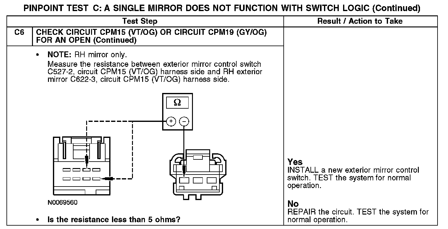 - When ground is received through circuit CPM15 (VT/OG)/CPM19 (GY/OG) and power through circuit CPM23 (GY), the LH/RH exterior mirror will operate down.
