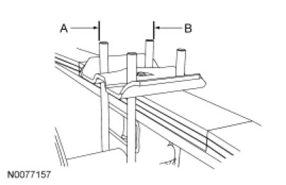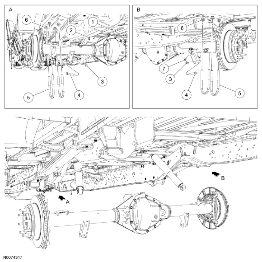 17. NOTE: When installing new U-bolts, the measurement between A and B should be 107 mm (4.21 in) ± 3 mm (0.12 in) for E150/E250/E350 vehicles and 112 mm (4.41 in) ± 3 mm (0.12 in) for E450 vehicles. This is important for providing the correct U-bolt clamp load and retention of parts.