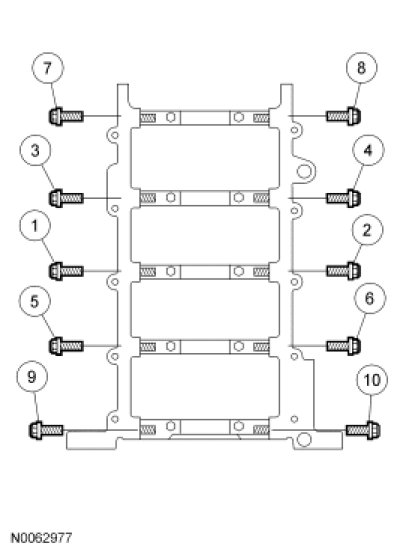 Tighten the 10 vertical main bearing cap fasteners in the sequence shown, in 2 stages:Stage 1: Tighten to 40 Nm (30 lb-ft).