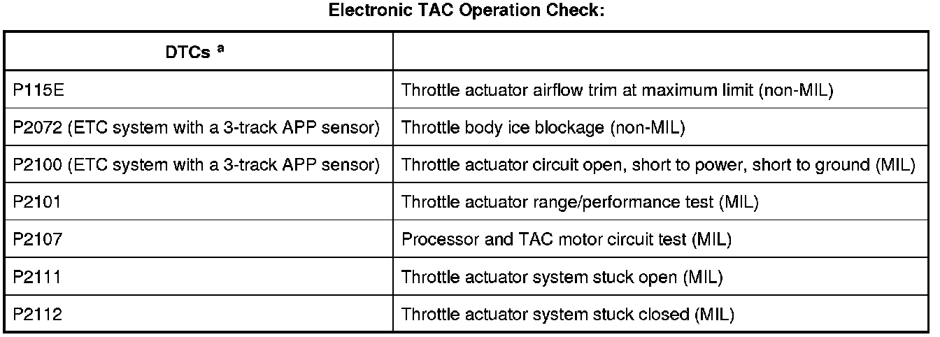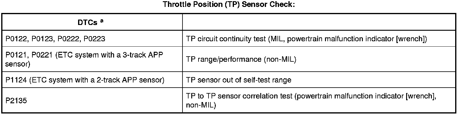 a - Correlation and range/performance - sensor disagreement between processors internal to the PCM, TP inconsistent with requested throttle plate position. Monitor execution is continuous. Monitor false detection duration is less than 1 second to register a concern. Refer to Diagnostic Trouble Code (DTC) Charts and Descriptions for additional DTC information.