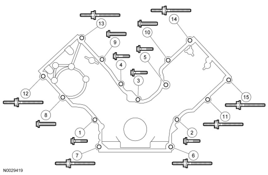 Tighten the 15 engine front cover fasteners in sequence in 3 stages.Stage 1: Tighten fasteners 1 through 5 to 25 Nm (18 lb-ft).