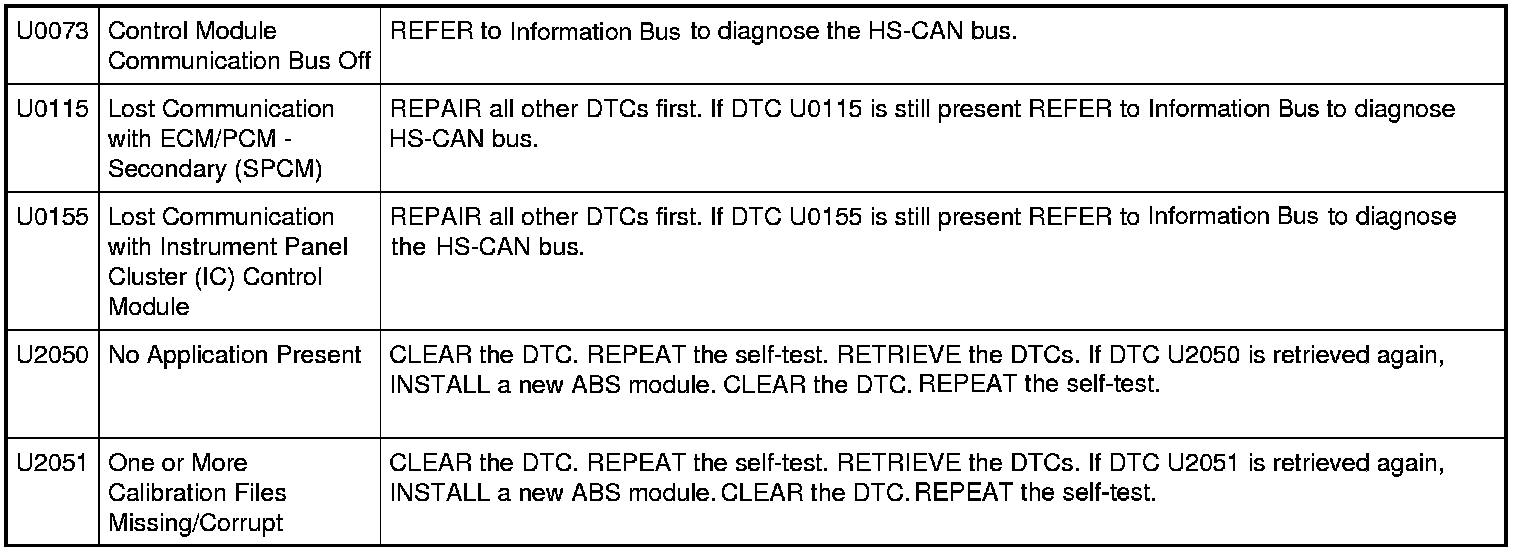 NOTE: This DTC chart only applies to vehicles equipped with ABS and Engine Only Traction Control (EOTC), it does not apply to vehicles equipped with Electronic Stability Control (ESC) or Roll Stability Control (RSC(R)). Refer to Inspection and Verification for information on identifying the vehicle brake system. Anti-Lock Control