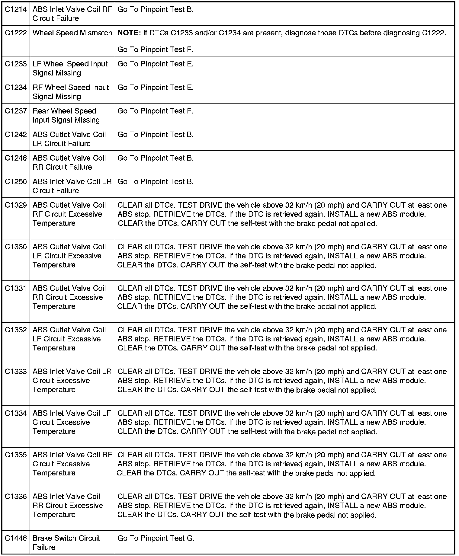 ABS Module DTC Chart