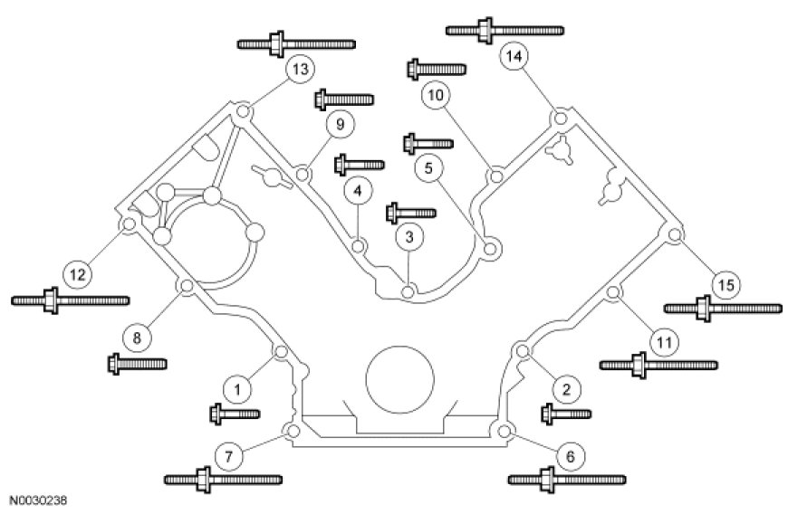Tighten the engine front cover fasteners in the sequence shown in 2 stages.