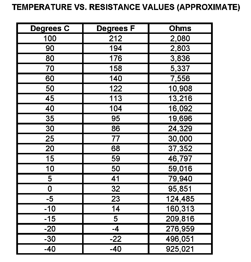Temperature Vs. Resistance Values (Approximate):