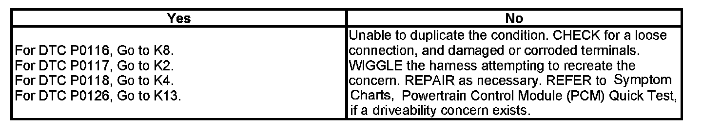 K1 : PRELIMINARY DIAGNOSIS FOR DIAGNOSTIC TROUBLE CODES (DTCS) P0116, P0117, P0118 OR P0126