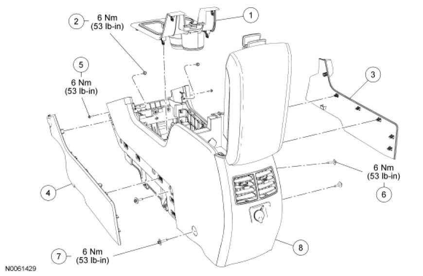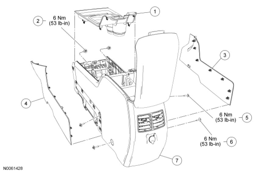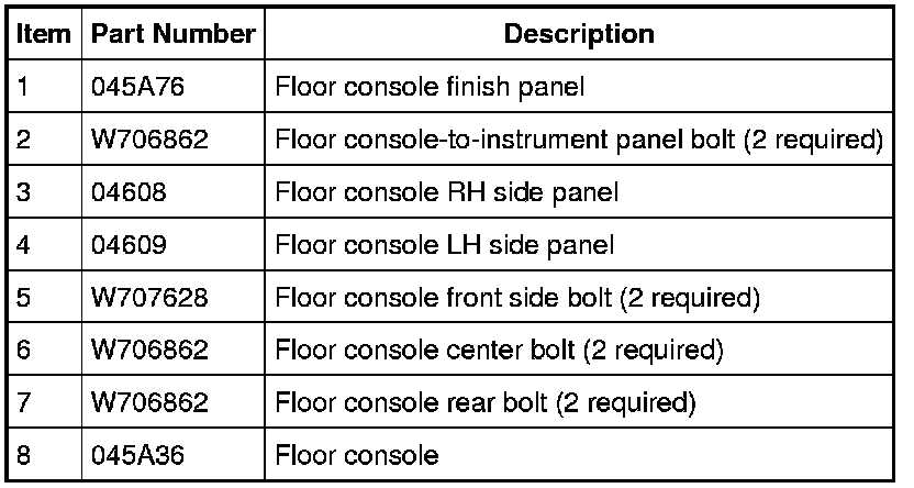 Position the seats rearward and remove the 2 floor console side panels and 2 floor console center bolts.