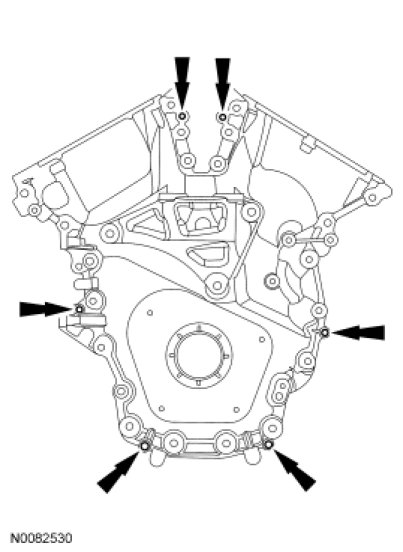 - Tighten the bolts one turn at a time in a criss-cross pattern until the engine front cover-to-cylinder block seal is released.