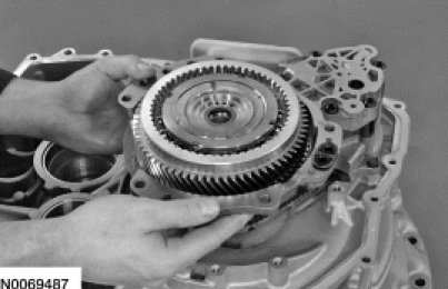 43. Inspect the transfer shaft fluid dam to be sure it is seated evenly into the torque converter housing.