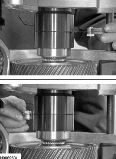 33. Remove the Differential/Transfer Gear Bearing Shim Gauge 307-591/3 (4 spacers) from the transaxle case.