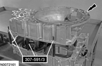 32. Remove the torque converter housing and the Differential/Transfer Gear Bearing Shim Gauge 307-591/3 (4 nuts, bolts and spacers and 8 washers) from the transaxle case.