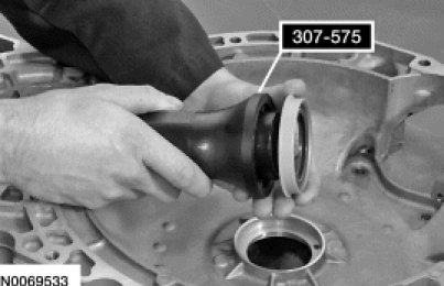 Using the Converter Seal Installer 307-575 and a dead blow hammer, install the torque converter hub seal in the torque converter housing.